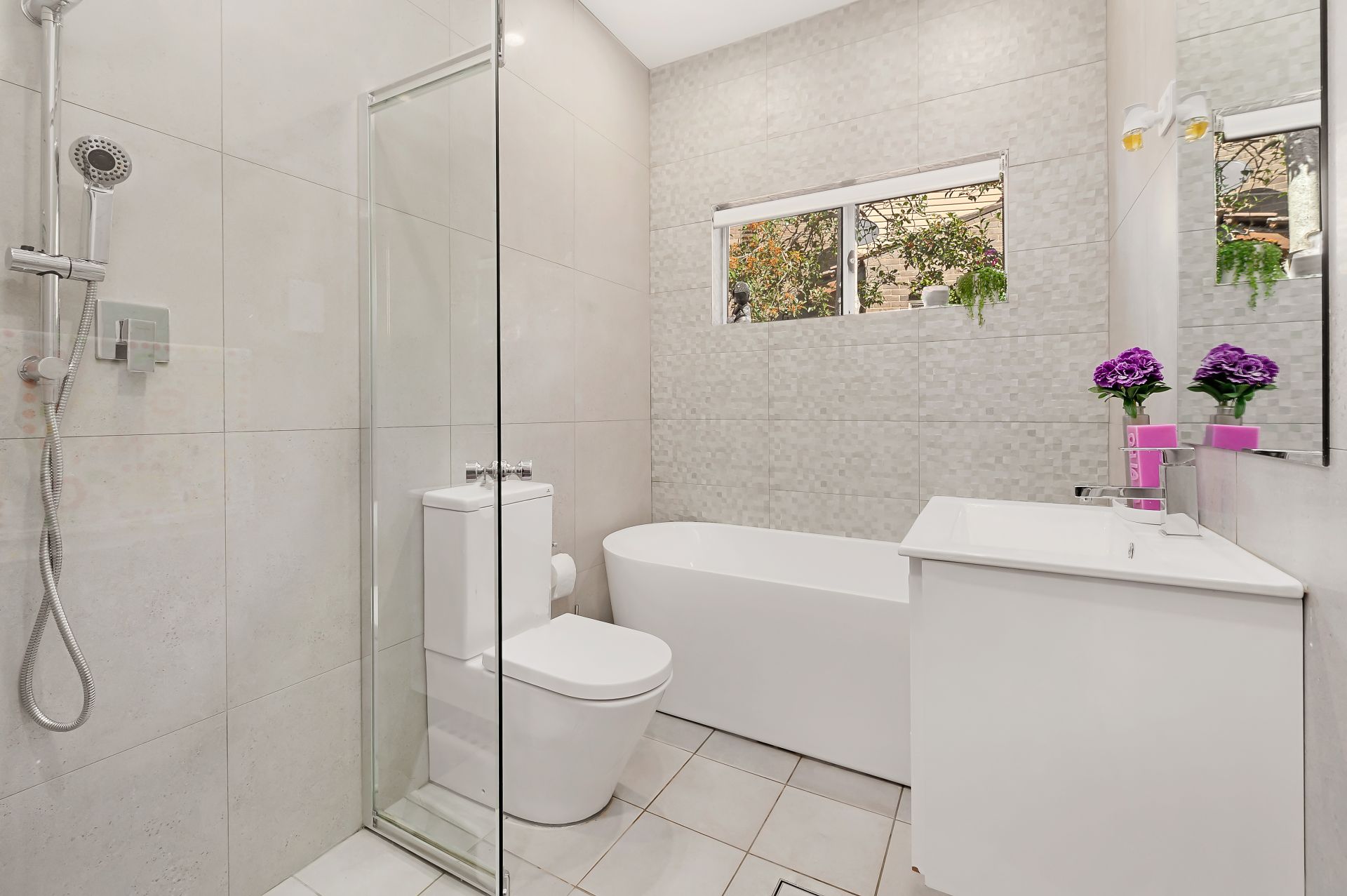 - Fully-tiled bathrooms, main with freestanding bath