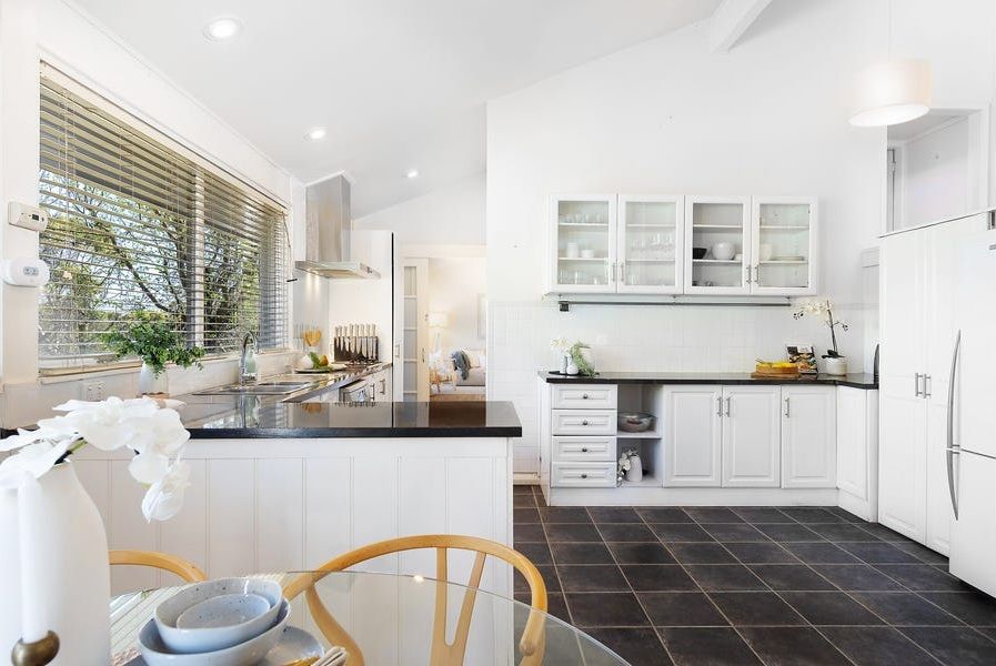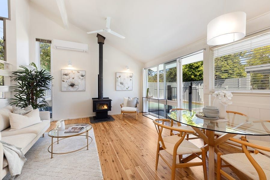 Large light filled living spaces and wooden floors make for easy maintenance. The modern kitchen has plenty of storage options.