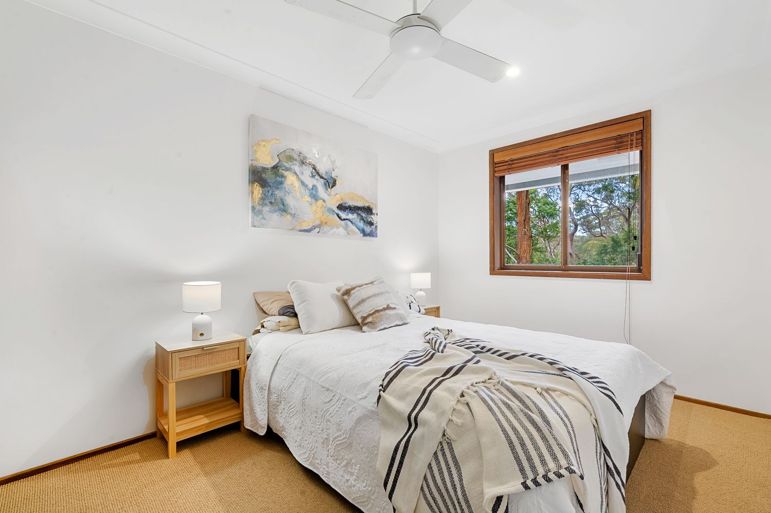 - Breathtaking alfresco deck with a wood-burning Chiminea, ceiling fan, and serene bushland views.