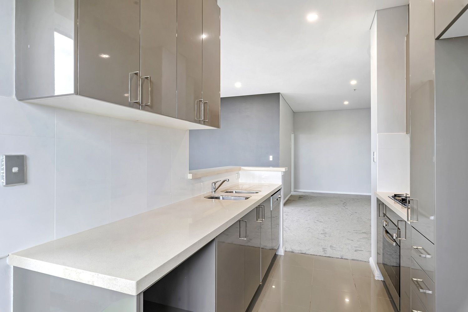 The modern kitchen is equipped with a gas cooktop and flows effortlessly to a casual dining area, with tiled flooring for easy care and everyday practicality.