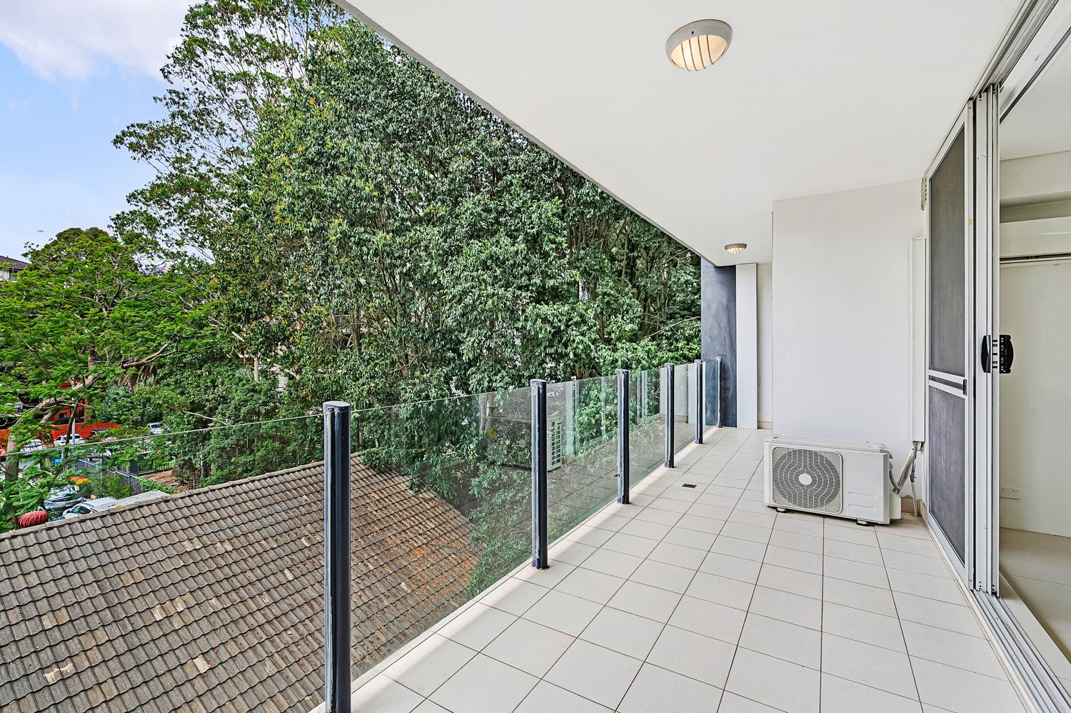 The tiled living area flows to a balcony with a peaceful leafy outlook, while the bedrooms feature easy-care floorboards, creating a comfortable and functional living environment.