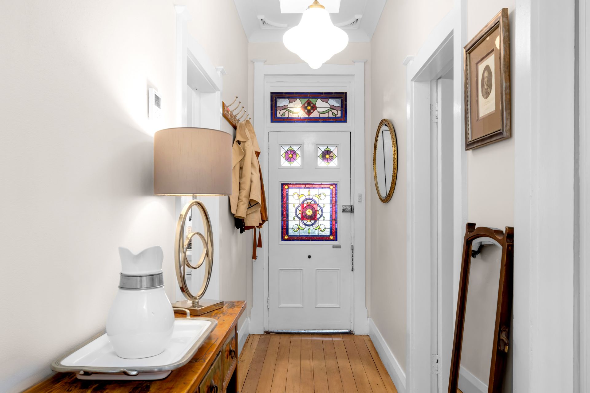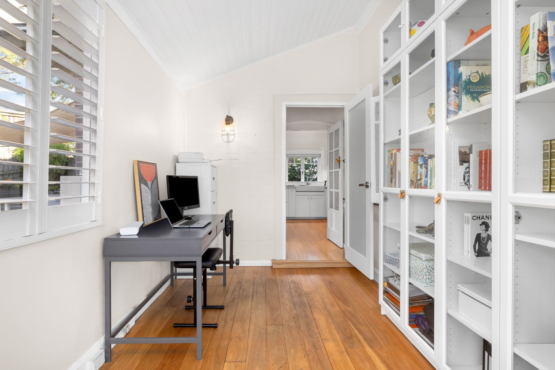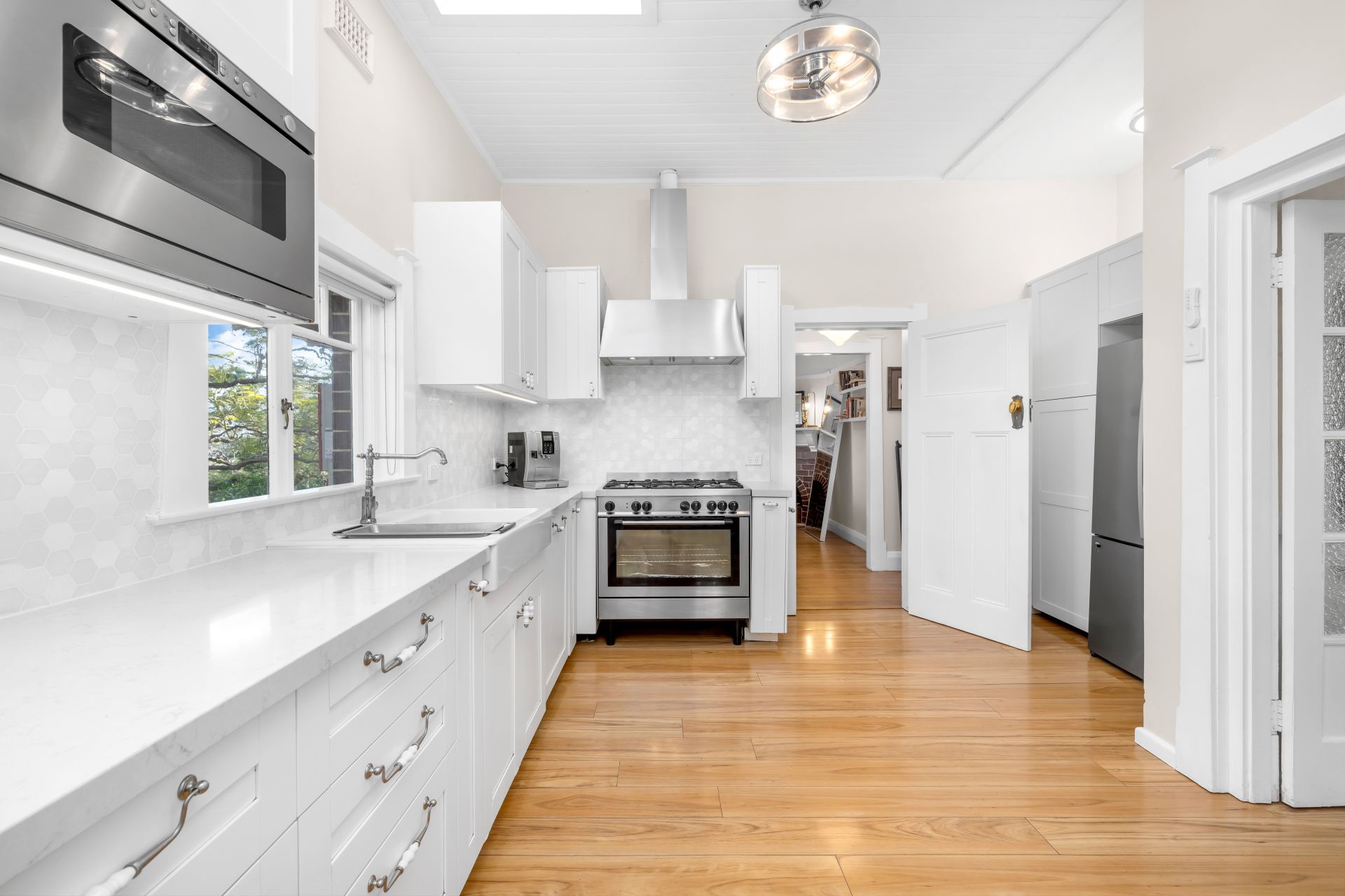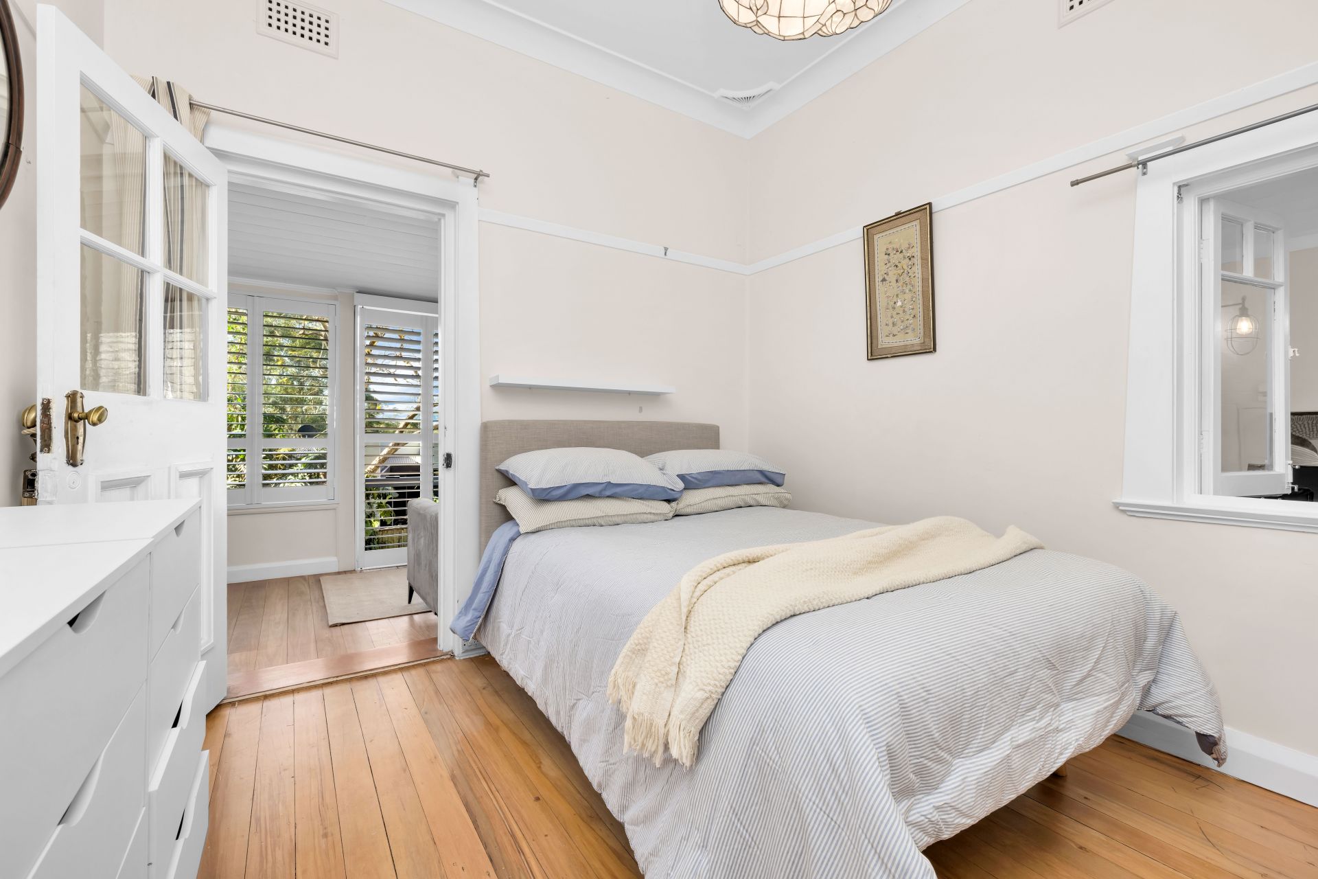 Framed by sculpted gardens and mature trees, the home radiates warmth, privacy and permanence. Sunlight filters through exquisite Federation-style stained glass windows, illuminating interiors enhanced by high ceilings, ornate detailing, French shutters and original fireplaces. Rare New Zealand Kauri floorboards flow gracefully throughout, complemented by a classic Blackbutt timber verandah that welcomes you with understated grandeur.
