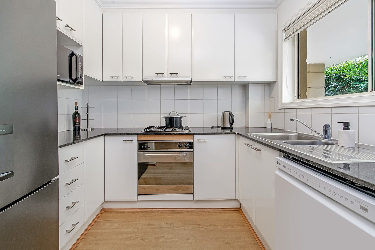 - Modern kitchen with granite benches, gas cooktops & dishwasher