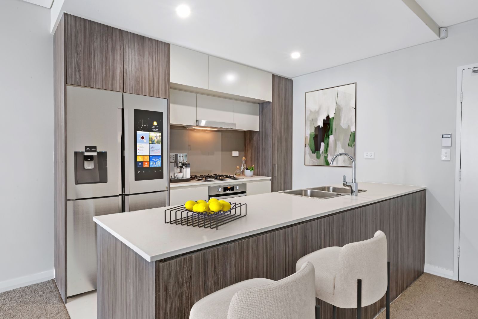 - Sleek stone finished kitchen, modern dishwasher and gas appliances