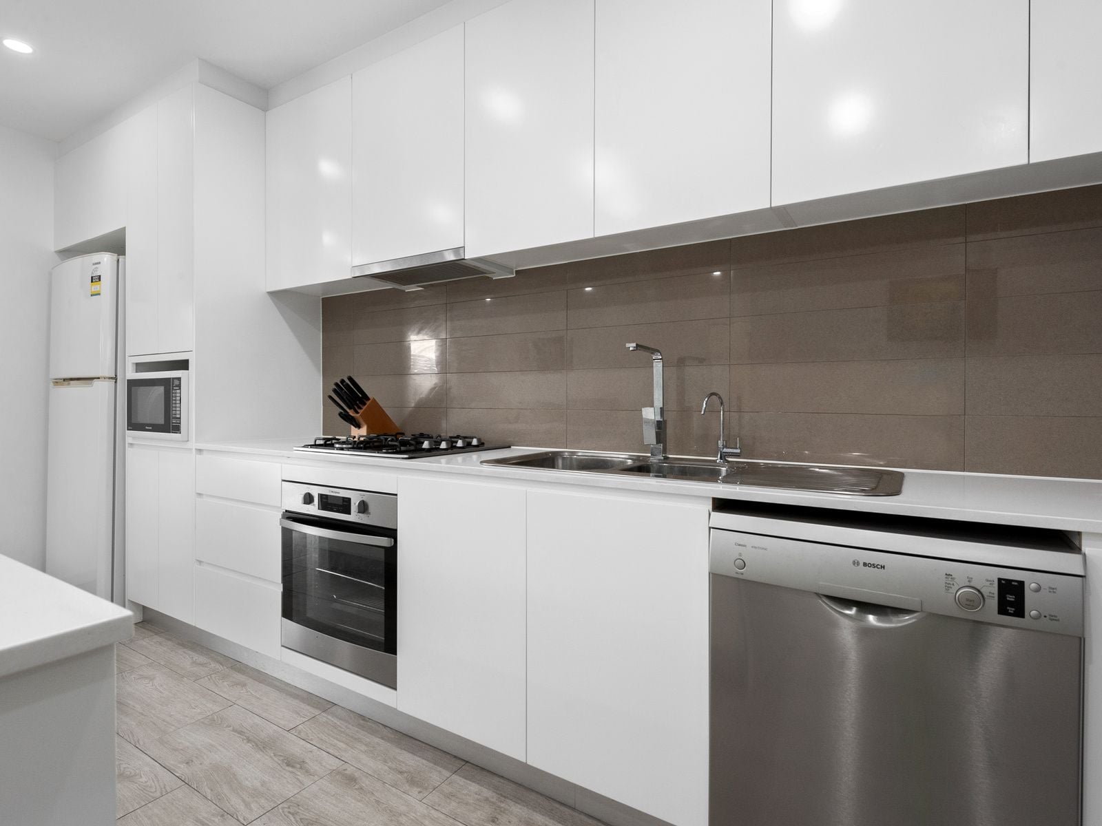 The sleek and spacious modern kitchen is a true centerpiece, featuring stone bench tops, an island, and top-of-the-line fixtures. It offers both style and functionality, catering to the needs of even the most discerning chefs.