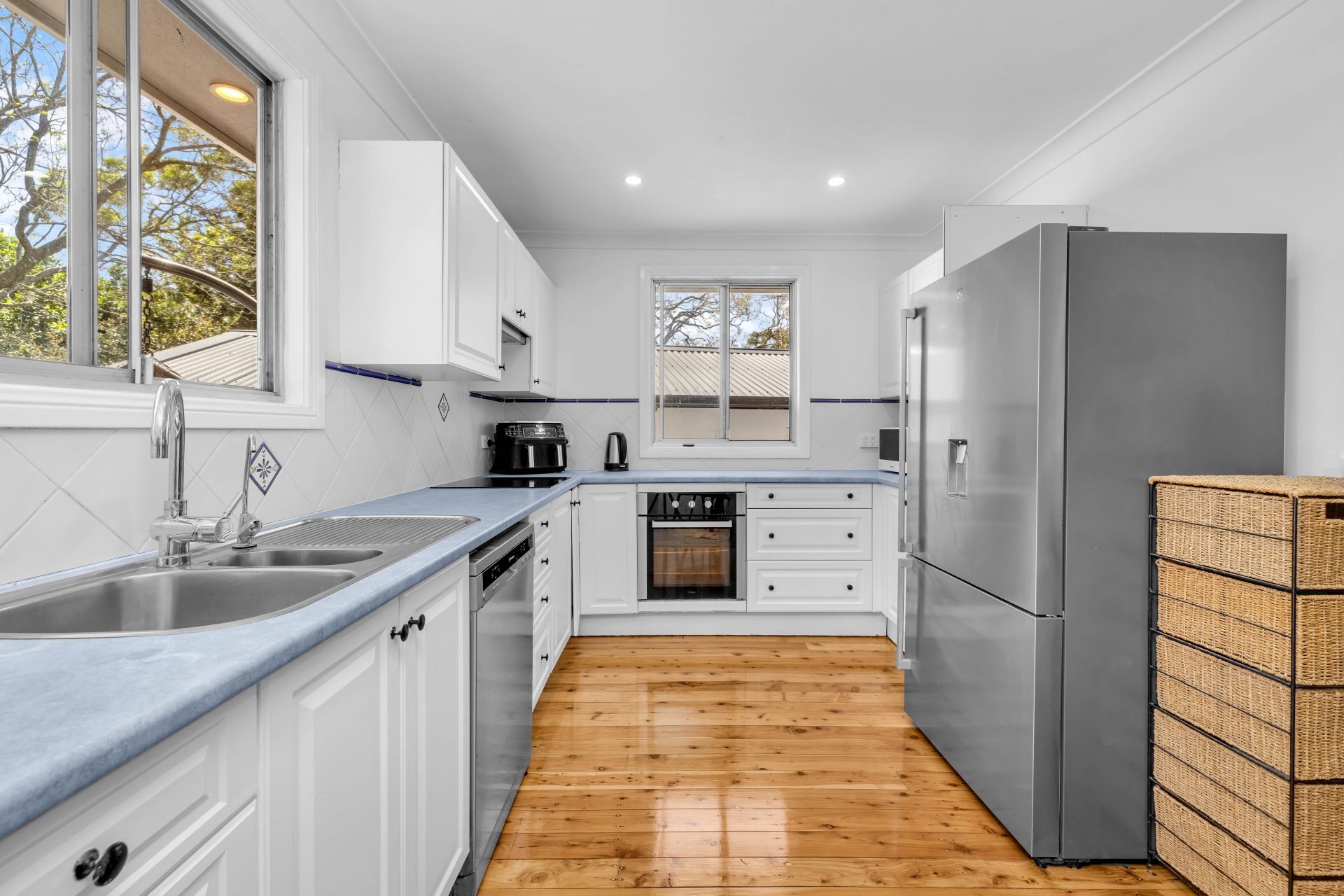 The modern kitchen offers generous bench space and storage, connecting seamlessly to a large covered deck that overlooks the backyard, perfect for weekend BBQs, outdoor dining, and family gatherings that spill into the garden.
